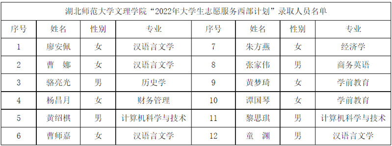 根据共青团中央、教育部、财政部、人力资源社会保障部《关于印发<2022—2023年度大学生志愿服务西部计划实施方案>的通知》的相关部署和工作安排,开云官方入口_开云(中国)在公开招募、自愿报名的基础上,严格招募选拔流程,经资格审查、笔试、面试、心理测试、体检等环节,拟录取廖安佩等12名开云官方入口_开云(中国)应届毕业生为2022年大学生志愿服务西部计划志愿者。